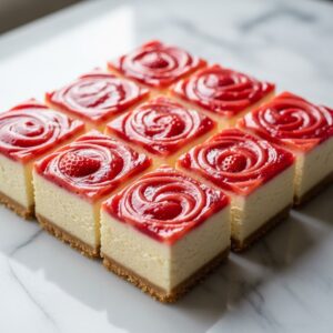 Creamy cheesecake layered with strawberry puree on a buttery crust.