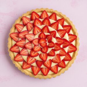 A buttery tart shell filled with creamy custard and fresh strawberries.