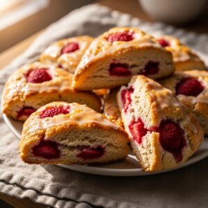 Tender scones with chunks of fresh strawberries and a light glaze.