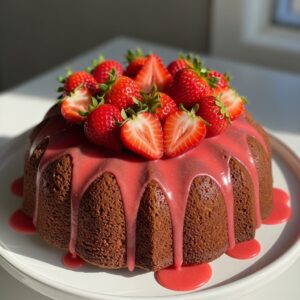 A moist bundt cake filled with strawberry puree and drizzled with glaze.