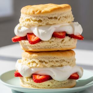 Soft biscuits layered with fresh strawberries and whipped cream.