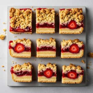Easy bars with a buttery crust, strawberry layer, and crumble topping.