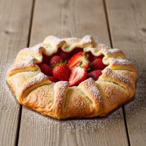 Rustic free-form tart with strawberries baked in a flaky crust.