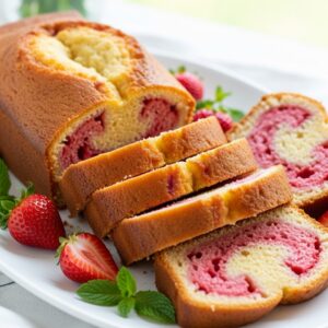 Moist pound cake with strawberry puree swirled into the batter.