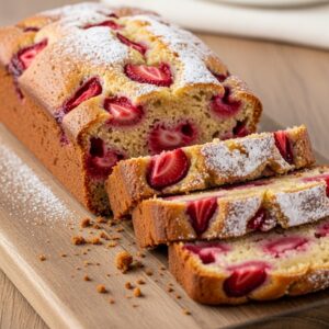 Moist loaf cake with chopped strawberries baked into the batter.
