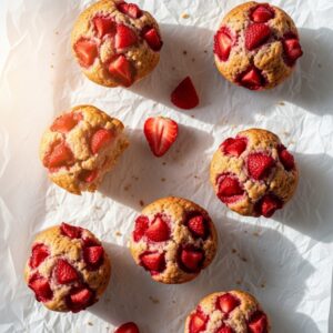 Crispy on top, soft inside muffins featuring fresh strawberries.