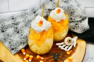 They’re layered with pineapple, oranges, and whipped cream for a festive effect. This is a refreshing option for balancing out all the sweets at a Halloween party.