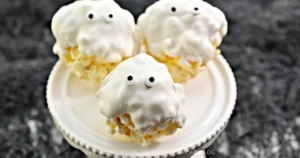 They’re made with marshmallows and popcorn, then turned into little ghost shapes. Add chocolate chip eyes, and you’ll have a snack that’s both cute and spooky.