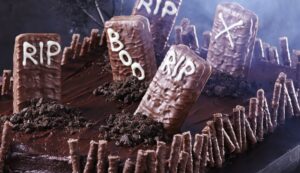 Graveyard Brownies are a spooky dessert that doubles as a Halloween decoration.