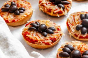 Spider Pizza Bites are mini pizzas decorated with black olive spiders.