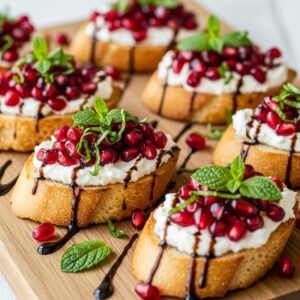 Spread ricotta or goat cheese on toasted baguette slices, then sprinkle with pomegranate seeds and drizzle with honey or balsamic glaze.