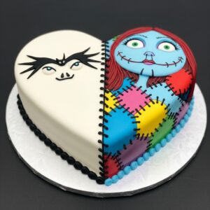 Design a heart-shaped cake divided into two halves — one for Jack in white and black, one for Sally in colorful patchwork — joined by a stitched icing border.