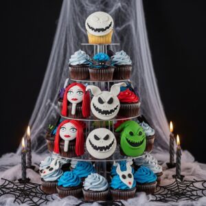 Stack cupcakes decorated with Jack, Sally, and Oogie Boogie faces to form a tower.