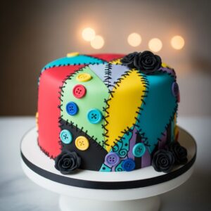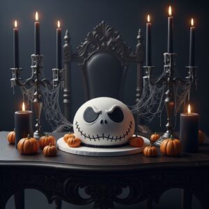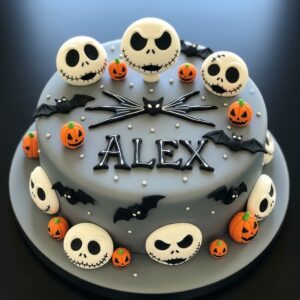 A classic choice! Bake a round cake and decorate it with white fondant, then pipe Jack’s iconic stitched grin and large black eyes.