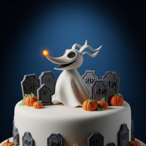 Make a cute ghostly cake using white fondant and add Zero’s orange candy nose.