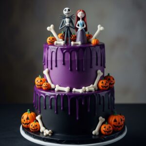 Top it with store-bought Jack or Sally toppers, candy bones, or edible eyes for a gothic finish that’s easy but dramatic.
