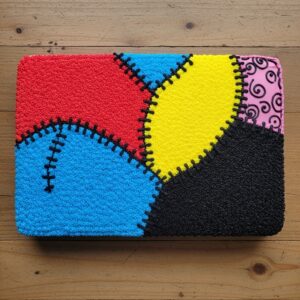 Make a simple rectangular cake and decorate it with colorful buttercream sections — red, yellow, teal, and black — to mimic Sally’s dress.
