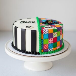 Frost half your cake as Jack’s black-and-white pinstripe look and the other half as Sally’s colorful patchwork pattern.
