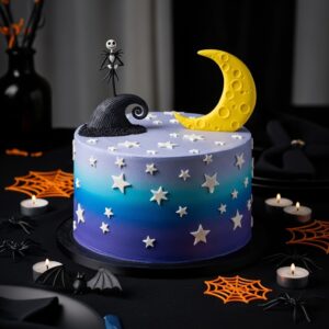 Make a simple blue or purple frosted cake and add white icing stars, a yellow moon, and Jack standing on the Spiral Hill (use a printed cake topper or silhouette cutout).