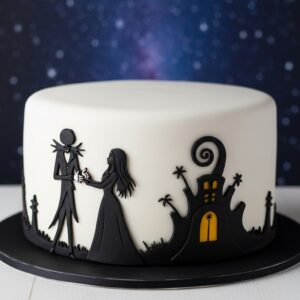 Cover your cake in white fondant, then cut black fondant silhouettes of Jack, Sally, and the Spiral Hill scene.