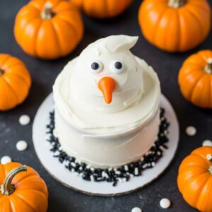 Bake a small loaf or round cake and shape it slightly like a ghost.