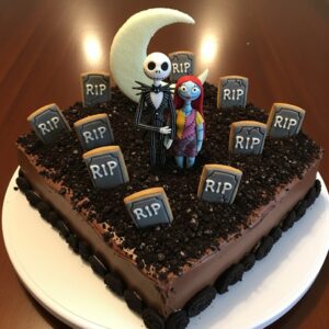 Frost your cake with chocolate buttercream and decorate with crushed Oreo “dirt,” cookie tombstones, and small plastic or fondant figures of Jack and Sally.