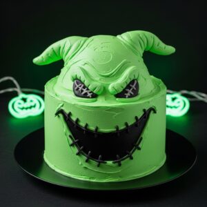 Frost your cake with bright green buttercream, then add black icing lines for Oogie Boogie’s stitched mouth and eyes.
