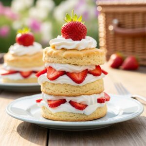 Sweet biscuits layered with fresh strawberries and whipped cream.