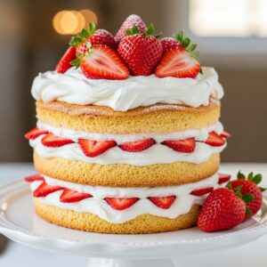 Fluffy biscuits layered with whipped cream and fresh strawberries — simple and summery.