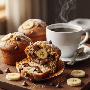 Moist banana muffins dotted with melted chocolate chips.