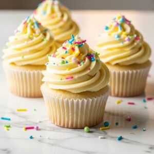 Soft and fluffy cupcakes topped with creamy vanilla frosting — perfect for birthdays or holidays.