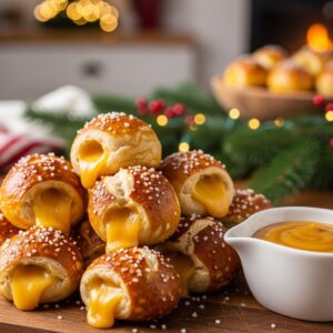 Soft, warm pretzel bites filled with melted cheddar cheese are perfect for dipping in mustard or beer cheese sauce.