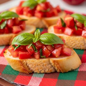 Crispy baguette slices topped with diced tomatoes, garlic, olive oil, and fresh basil create a refreshing and easy appetizer.