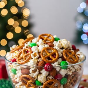 For a fun and sweet-savory twist, mix popcorn with pretzels, nuts, and red-and-green chocolate candies.