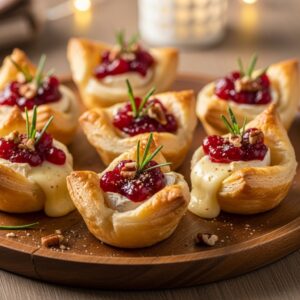 Elegant and festive, these small puff pastry cups are filled with creamy brie and tart cranberry sauce.