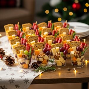 Fill small cups with cheese cubes, olives, nuts, grapes, and sliced meats — guests can grab and mingle easily.