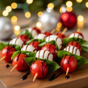 Fresh mozzarella, cherry tomatoes, and basil leaves drizzled with balsamic glaze create a colorful and refreshing bite.