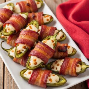 Fill jalapeños with cream cheese, wrap them in bacon, and bake until crisp. Serve with ranch or chipotle dip for extra flavor.