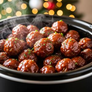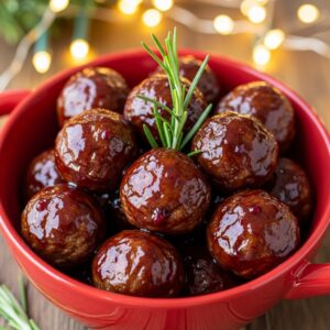 Juicy meatballs coated in a sweet-tangy cranberry glaze for a flavorful holiday treat.