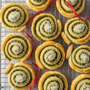 Flaky puff pastry swirled with pesto and cheese, baked to perfection.