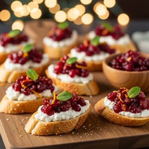 Crispy crostini topped with creamy goat cheese and tart cranberry relish — elegant and festive.