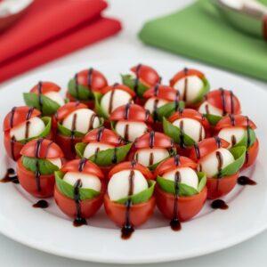 Hollowed-out cherry tomatoes filled with mozzarella, basil, and a drizzle of balsamic glaze create a light and refreshing savory appetizer.