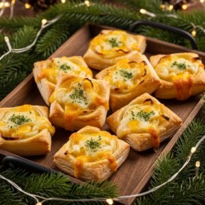 Flaky, golden puff pastry filled with cheese, caramelized onions, and herbs make the perfect finger food for your Christmas spread