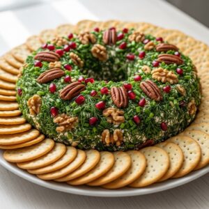 A creative twist on the classic cheese ball — shape the mixture into a wreath and roll it in chopped herbs, nuts, and pomegranate seeds. Serve with crackers or toasted bread.
