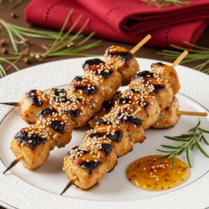 Tender chicken skewers brushed with a savory honey mustard glaze bring a balance of sweet and tangy flavors.