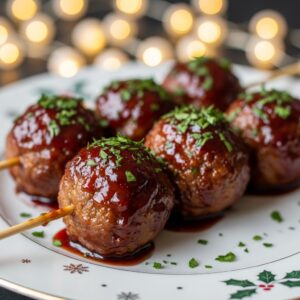 Savory meatballs glazed in a cranberry barbecue sauce and served on skewers make a perfect grab-and-go party snack.