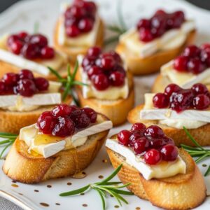 Toasted baguette slices topped with creamy brie, tangy cranberry sauce, and a drizzle of honey offer a beautiful balance of sweet and savory flavors.
