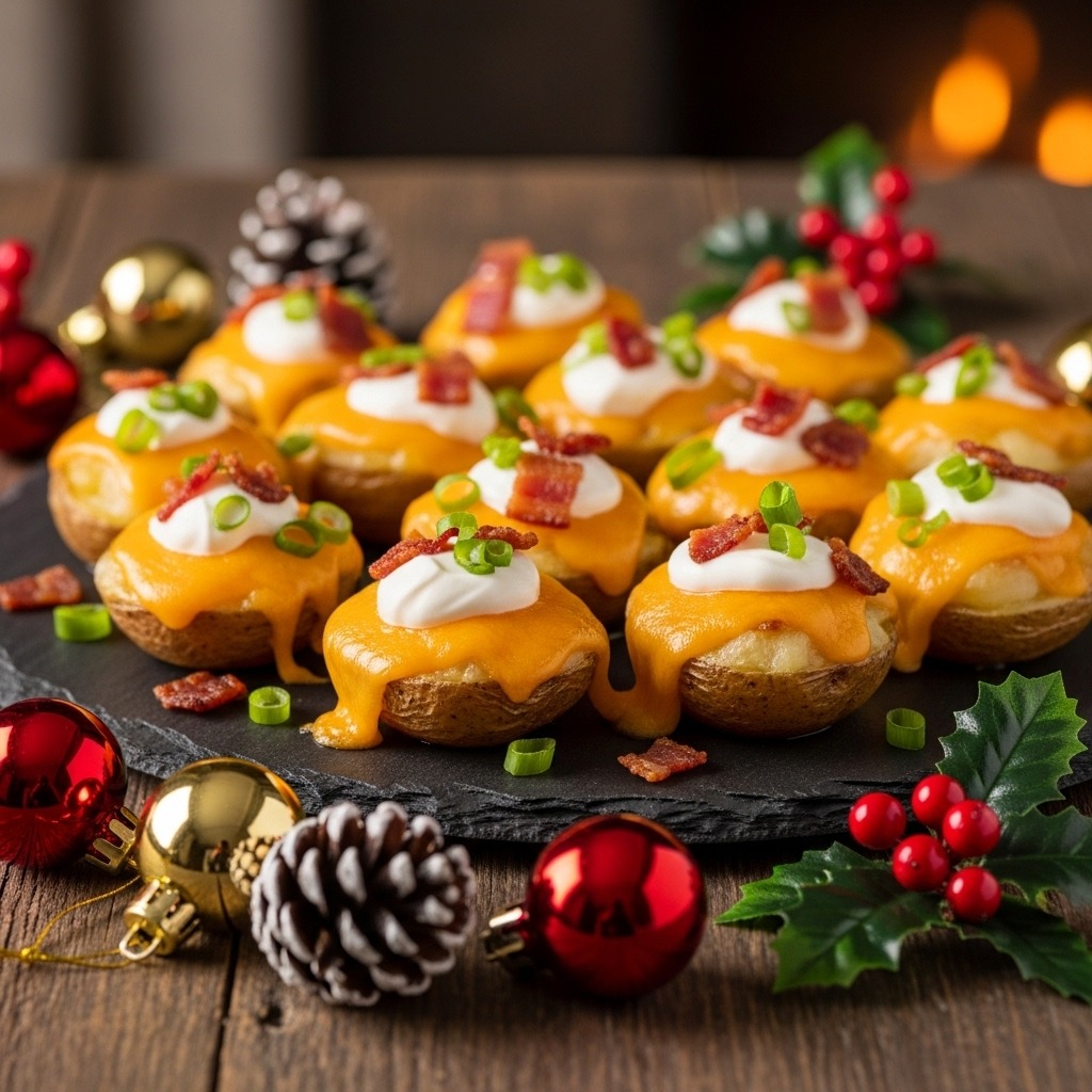 Mini potato halves topped with melted cheese, sour cream, bacon bits, and chives are comfort food in bite-sized form.