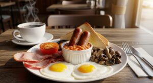 Think crispy back bacon, juicy pork sausages, sunny-side-up eggs, buttered toast, baked beans in tomato sauce, sautéed mushrooms, and grilled tomatoes — all neatly arranged on one generous plate.