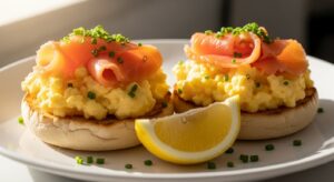 The soft, buttery eggs pair beautifully with the smoky richness of the salmon, while the muffin provides a sturdy, slightly chewy base. Garnish with chopped chives and a squeeze of lemon juice for freshness.